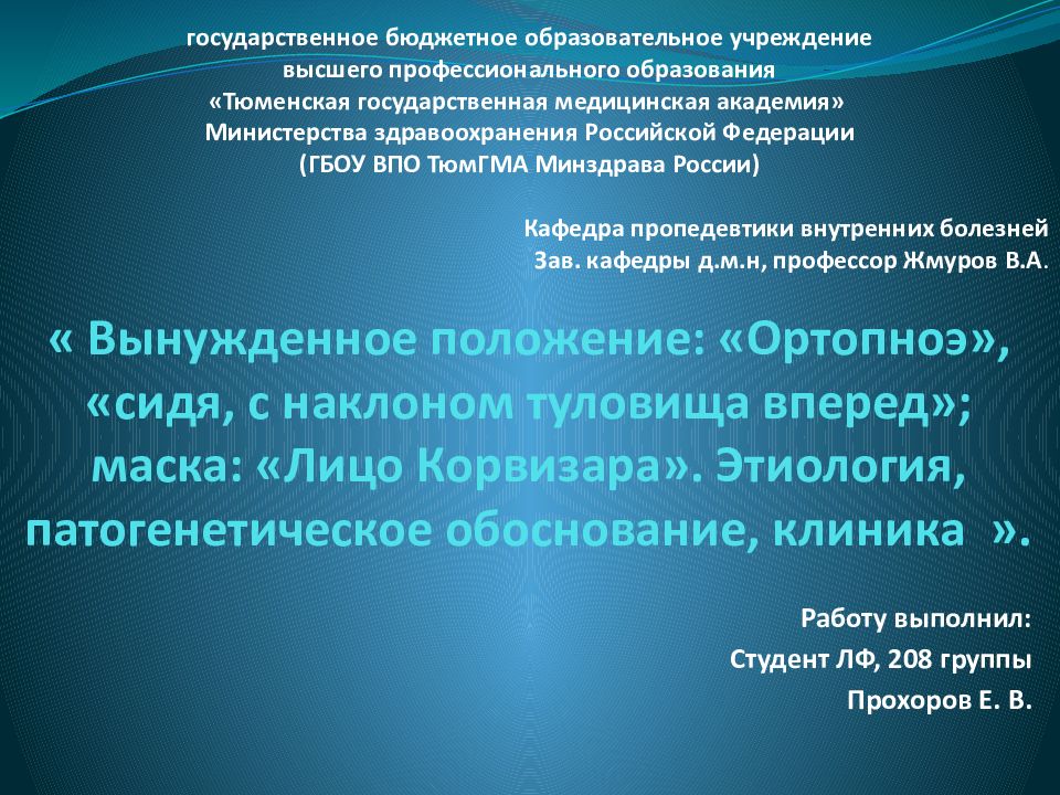 Работу выполнил: Студент ЛФ, 208 группы Прохоров Е. В. государственное бюджетное образовательное учреждение высшего профессионального образования «Тюменская государственная медицинская академия» Министерства здравоохранения Российской Федерации (ГБОУ ВПО ТюмГМА Минздрава России ) Кафедра пропедевтики внутренних болезней Зав. кафедры д.м.н, профессор Жмуров В.А.