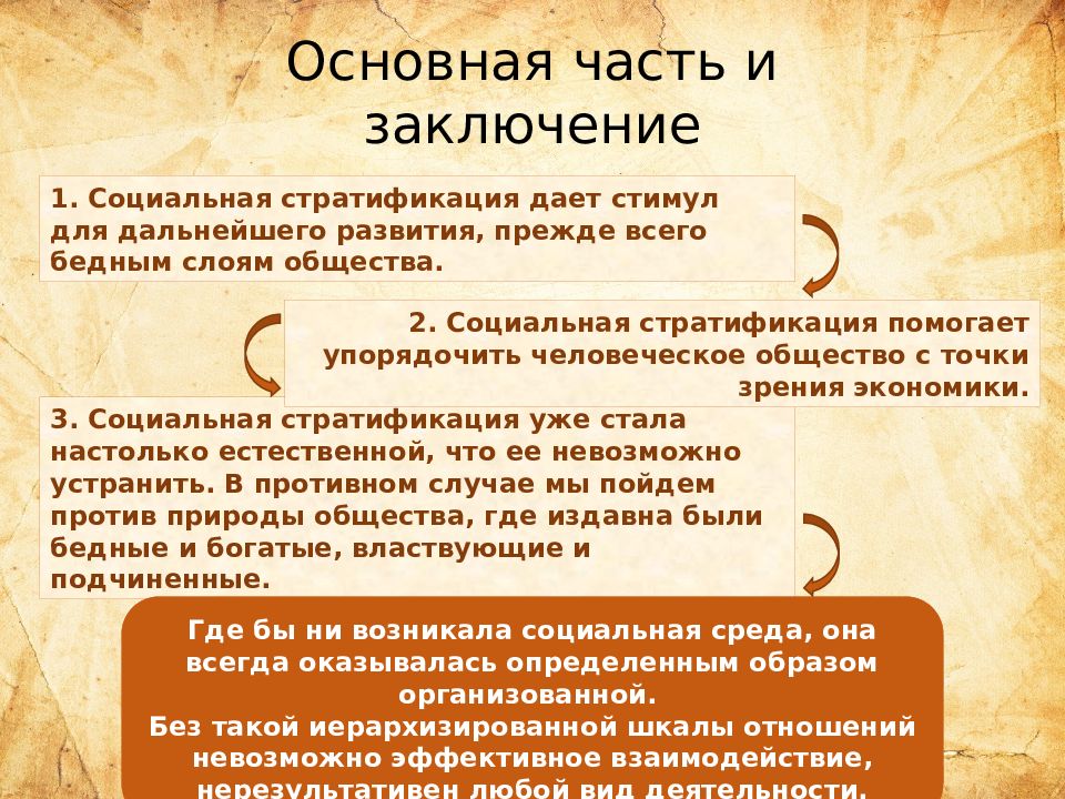 3. Социальная стратификация уже стала настолько естественной, что ее невозможно устранить. В противном случае мы пойдем против природы общества, где издавна были бедные и богатые, властвующие и подчиненные. Основная часть и заключение 2. Социальная стратификация помогает упорядочить человеческое общество с точки зрения экономики. 1. Социальная стратификация дает стимул для дальнейшего развития, прежде всего бедным слоям общества. Где бы ни возникала социальная среда, она всегда оказывалась определенным образом организованной. Без такой иерархизированной шкалы отношений невозможно эффективное взаимодействие, нерезультативен любой вид деятельности.