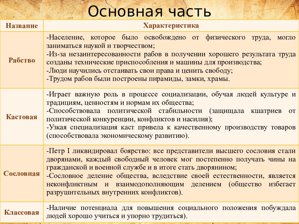 Основная часть Название Характеристика Рабство -Население, которое было освобождено от физического труда, могло заниматься наукой и творчеством; -Из-за незаинтересованности рабов в получении хорошего результата труда созданы технические приспособления и машины для производства; -Люди научились отстаивать свои права и ценить свободу; -Трудом рабов были построены пирамиды, замки, храмы. Кастовая -Играет важную роль в процессе социализации, обучая людей культуре и традициям, ценностям и нормам их общества; -Способствовала политической стабильности (защищала кшатриев от политической конкуренции, конфликтов и насилия); -Узкая специализация каст привела к качественному производству товаров ( способствовала экономическому развитию). Сословная -Петр I ликвидировал боярство: все представители высшего сословия стали дворянами, каждый свободный человек мог постепенно получать чины на гражданской и военной службе и в итоге стать дворянином; -Сословное деление общества, вследствие своей естественности, является неконфликтным и взаимодополняющим делением (общество избегает разрушительных внутренних конфликтов). Классовая - Н аличие потенциала для повышения социального положения побуждала людей хорошо учиться и упорно трудиться).