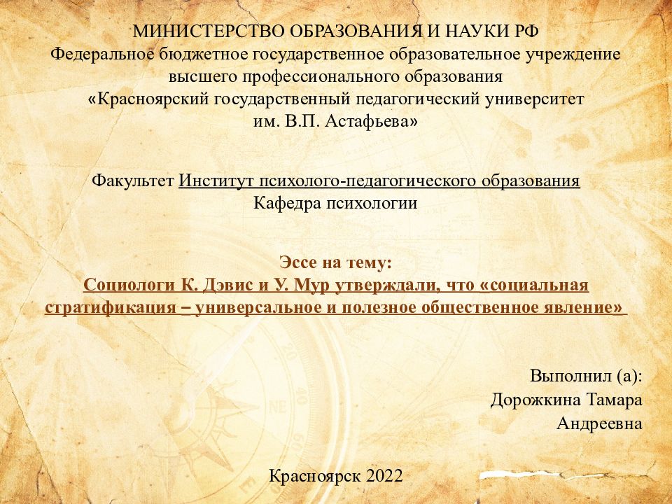 Выполнил (а): Дорожкина Тамара Андреевна МИНИСТЕРСТВО ОБРАЗОВАНИЯ И НАУКИ РФ Федеральное бюджетное государственное образовательное учреждение высшего профессионального образования « Красноярский государственный педагогический университет им. В.П. Астафьева » Факультет Институт психолого-педагогического образования Кафедра психологии Эссе на тему: Социологи К. Дэвис и У. Мур утверждали, что « социальная стратификация – универсальное и полезное общественное явление » Красноярск 2022
