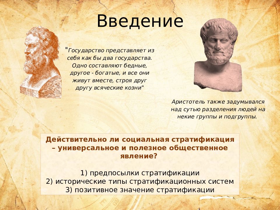 Действительно ли социальная стратификация – универсальное и полезное общественное явление? 1) предпосылки стратификации 2) исторические типы стратификационных систем 3) позитивное значение стратификации Введение " Государство представляет из себя как бы два государства. Одно составляют бедные, другое - богатые, и все они живут вместе, строя друг другу всяческие козни" Аристотель также задумывался над сутью разделения людей на некие группы и подгруппы.