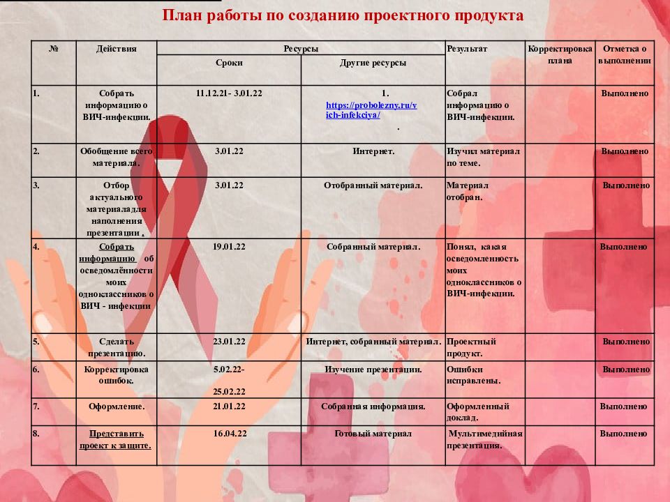 № Действия Ресурсы Результат Корректировка плана Отметка о выполнении Сроки Другие ресурсы 1. Собрать информацию о ВИЧ-инфекции. 11.12.21- 3.01.22 1. https://probolezny.ru/vich-infekciya/. Собрал информацию о ВИЧ-инфекции. Выполнено 2. Обобщение всего материала. 3.01.22 Интернет. Изучил материал по теме. Выполнено 3. Отбор актуального материаладля наполнения презентации. 3.01.22 Отобранный материал. Материал отобран. Выполнено 4. Собрать информацию об осведомлённости моих одноклассников о ВИЧ - инфекции 19.01.22 Собранный материал. Понял, какая осведомленность моих одноклассников о ВИЧ-инфекции. Выполнено 5. Сделать презентацию. 23.01.22 Интернет, собранный материал. Проектный продукт. Выполнено 6. Корректировка ошибок. 5.02.22- 25.02.22 Изучение презентации. Ошибки исправлены. Выполнено 7. Оформление. 21.01.22 Собранная информация. Оформленный доклад. Выполнено 8. Представить проект к защите. 16.04.22 Готовый материал Мультимедийная презентация. Выполнено План работы по созданию проектного продукта