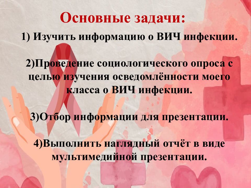 Основные задачи: 1) Изучить информацию о ВИЧ инфекции. 2)Проведение социологического опроса с целью изучения осведомлённости моего класса о ВИЧ инфекции. 3)Отбор информации для презентации. 4)Выполнить наглядный отчёт в виде мультимедийной презентации.