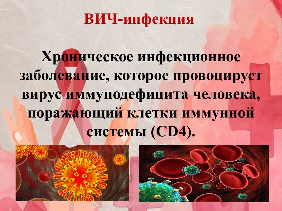 ВИЧ-инфекция Х роническое инфекционное заболевание, которое провоцирует вирус иммунодефицита человека, поражающий клетки иммунной системы (СD4).