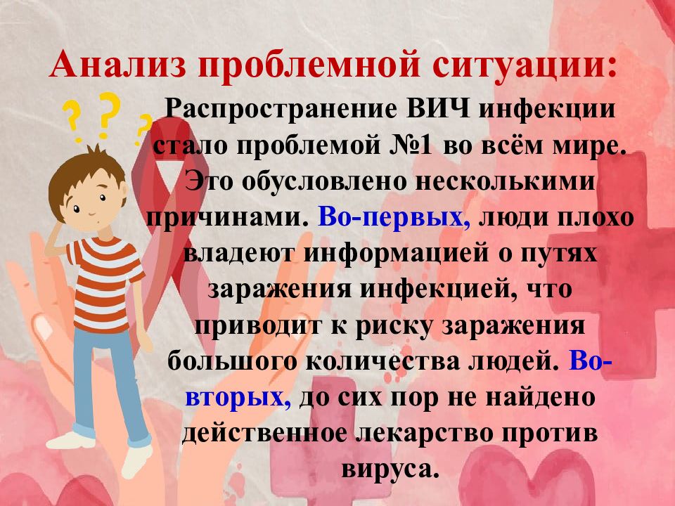Анализ проблемной ситуации: Распространение ВИЧ инфекции стало проблемой №1 во всём мире. Это обусловлено несколькими причинами. Во-первых, люди плохо владеют информацией о путях заражения инфекцией, что приводит к риску заражения большого количества людей. Во-вторых, до сих пор не найдено действенное лекарство против вируса.