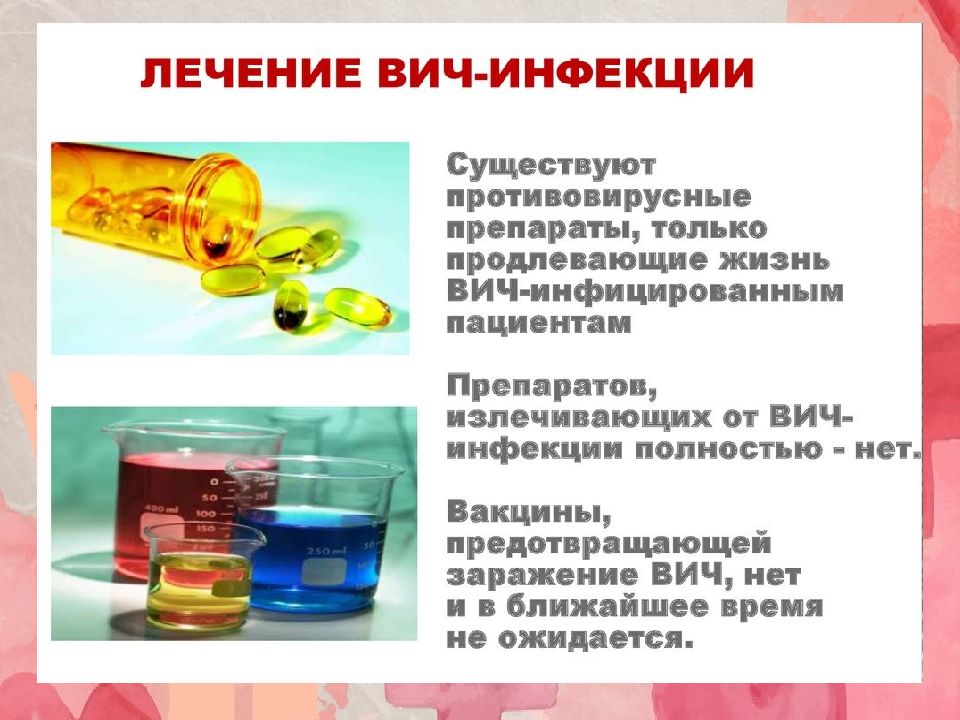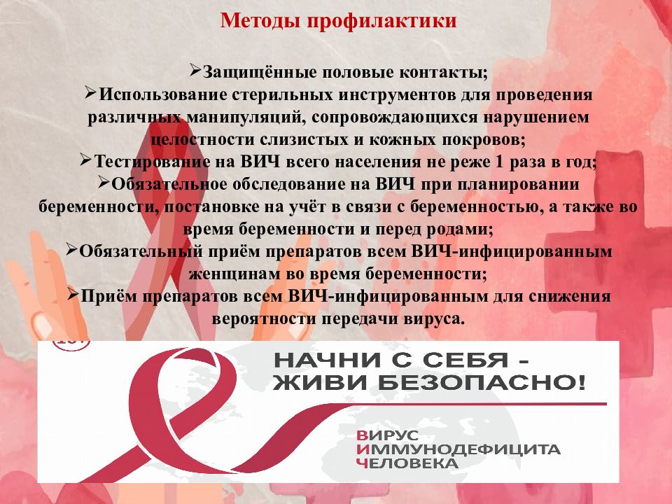Методы профилактики Защищённые половые контакты; Использование стерильных инструментов для проведения различных манипуляций, сопровождающихся нарушением целостности слизистых и кожных покровов; Тестирование на ВИЧ всего населения не реже 1 раза в год; Обязательное обследование на ВИЧ при планировании беременности, постановке на учёт в связи с беременностью, а также во время беременности и перед родами; Обязательный приём препаратов всем ВИЧ-инфицированным женщинам во время беременности; Приём препаратов всем ВИЧ-инфицированным для снижения вероятности передачи вируса.
