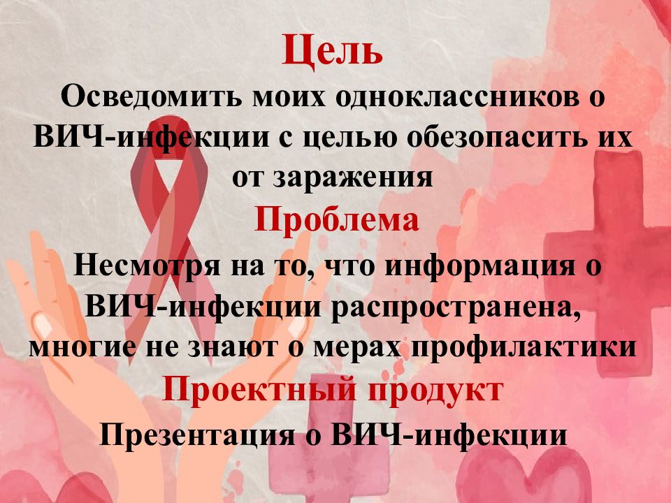Цель Осведомить моих одноклассников о ВИЧ-инфекции с целью обезопасить их от заражения Проблема Несмотря на то, что информация о ВИЧ-инфекции распространена, многие не знают о мерах профилактики Проектный продукт Презентация о ВИЧ-инфекции
