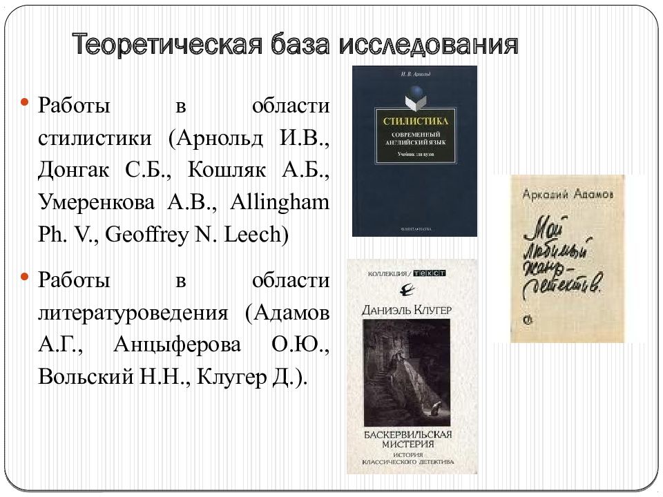 Р аботы в области стилистики ( Арнольд И.В., Донгак С.Б., Кошляк А.Б., Умеренкова А.В., Allingham Ph. V., Geoffrey N. Leech ) Работы в области литературоведения (Адамов А.Г., Анцыферова О.Ю., Вольский Н.Н., Клугер Д.).