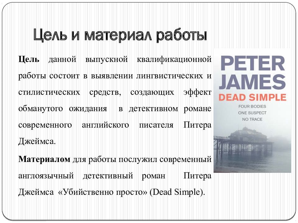 Цель данной выпускной квалификационной работы состоит в выявлении лингвистических и стилистических средств, создающих эффект обманутого ожидания в детективном романе современного английского писателя Питера Джеймса. Материалом для работы послужил современный англоязычный детективный роман Питера Джеймса «Убийственно просто» ( Dead Simple ).