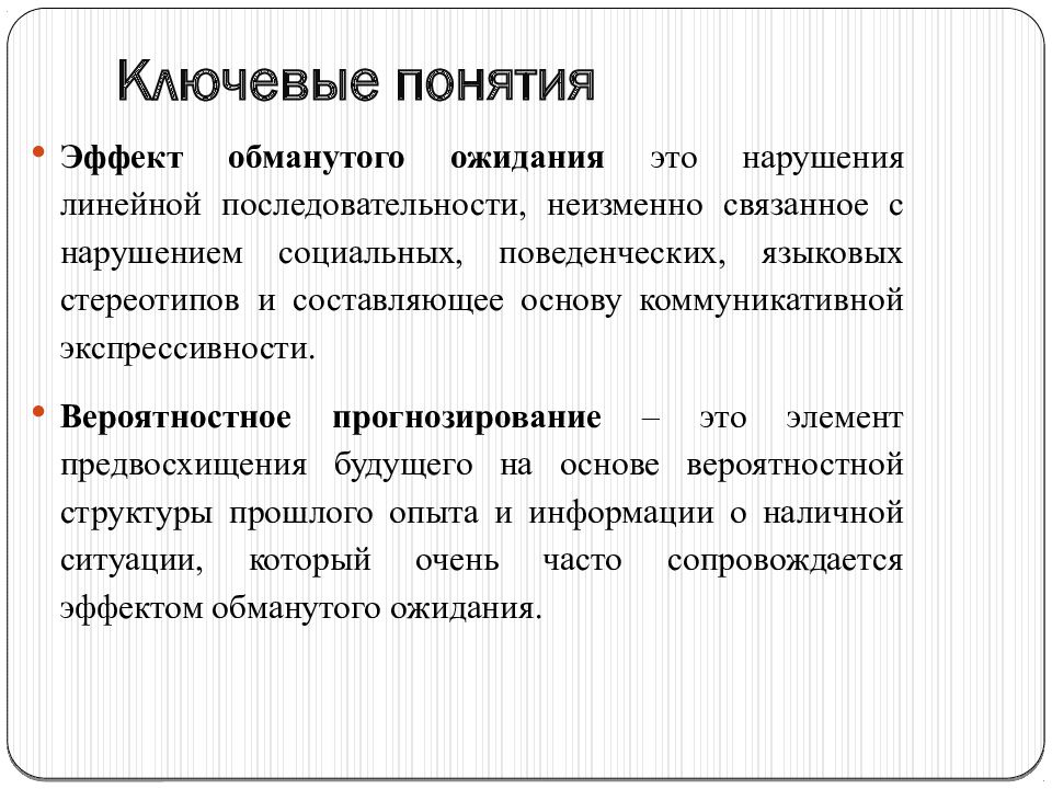 Эффект обманутого ожидания это нарушения линейной последовательности, неизменно связанное с нарушением социальных, поведенческих, языковых стереотипов и составляющее основу коммуникативной экспрессивности. Вероятностное прогнозирование – это элемент предвосхищения будущего на основе вероятностной структуры прошлого опыта и информации о наличной ситуации, который очень часто сопровождается эффектом обманутого ожидания.