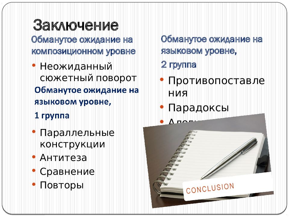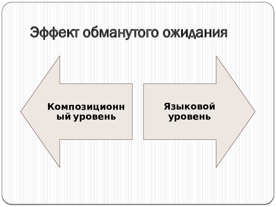 Обманутое ожидание на композиционном уровне Обманутое ожидание на языковом уровне, 2 группа Неожиданный сюж етный поворот Параллельные конструкции Антитеза Сравнение Повторы Противопоставления Парадоксы Алогизмы