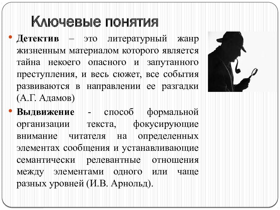 Детектив – это литературный жанр жизненным материалом которого является тайна некоего опасного и запутанного преступления, и весь сюжет, все события развиваются в направлении ее разгадки (А.Г. Адамов) Выдвижение - способ формальной организации текста, фокусирующие внимание читателя на определенных элементах сообщения и устанавливающие семантически релевантные отношения между элементами одного или чаще разных уровней (И.В. Арнольд).