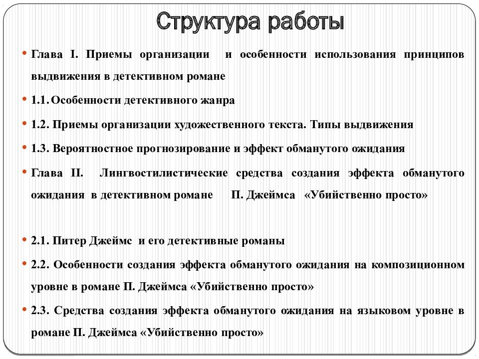 Глава I. Приемы организации и особенности использования принципов выдвижения в детективном романе 1.1. Особенности детективного жанра 1.2. Приемы организации художественного текста. Типы выдвижения 1.3. Вероятностное прогнозирование и эффект обманутого ожидания Глава II. Лингвостилистические средства создания эффекта обманутого ожидания в детективном романе П. Джеймса «Убийственно просто» 2.1. Питер Джеймс и его детективные романы 2.2. Особенности создания эффекта обманутого ожидания на композиционном уровне в романе П. Джеймса «Убийственно просто» 2.3. Средства создания эффекта обманутого ожидания на языковом уровне в романе П. Джеймса «Убийственно просто»