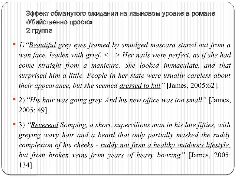 Слайд 12: Эффект обманутого ожидания на языковом уровне в романе «Убийственно просто» 2 группа