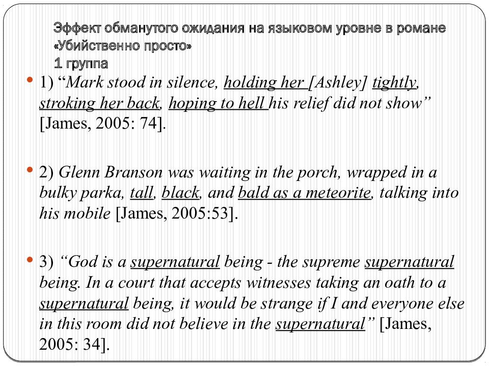 Слайд 11: Эффект обманутого ожидания на языковом уровне в романе «Убийственно просто » 1 группа