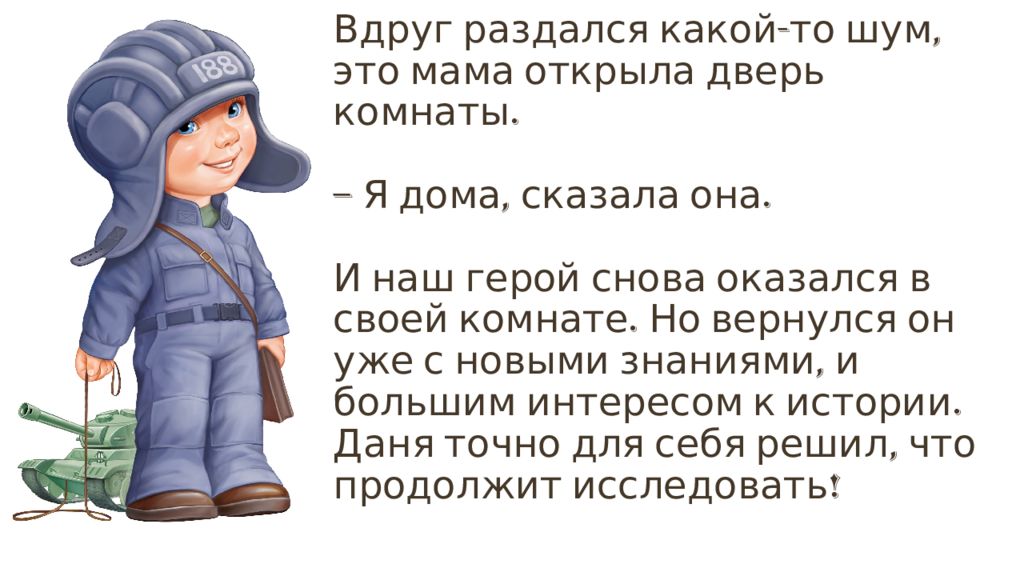 Вдруг раздался какой-то шум, это мама открыла дверь комнаты. – Я дома, сказала она. И наш герой снова оказался в своей комнате. Но вернулся он уже с новыми знаниями, и большим интересом к истории. Даня точно для себя решил, что продолжит исследовать!