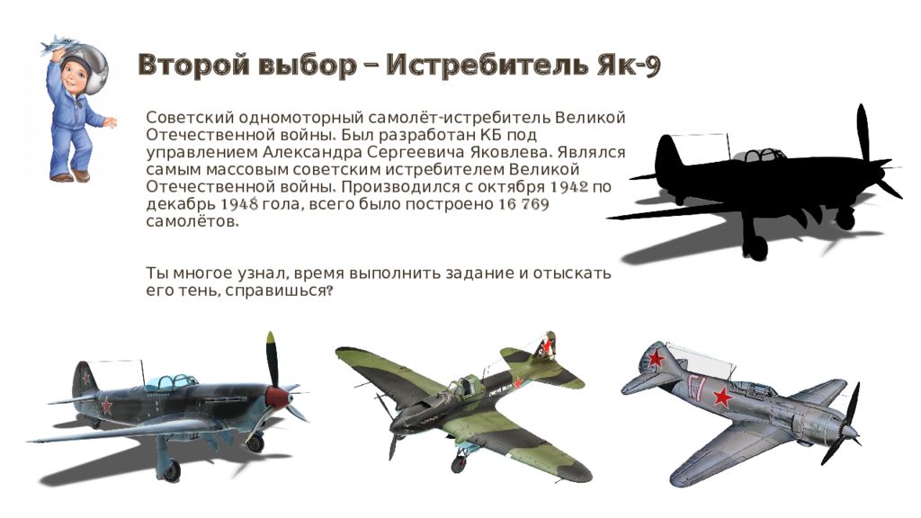 Советский одномоторный самолёт-истребитель Великой Отечественной войны. Был разработан КБ под управлением Александра Сергеевича Яковлева. Являлся самым массовым советским истребителем Великой Отечественной войны. Производился с октября 1942 по декабрь 1948 гола, всего было построено 16 769 самолётов. Ты многое узнал, время выполнить задание и отыскать его тень, справишься?