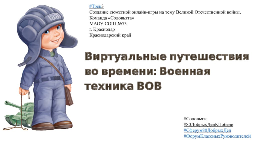 Виртуальные путешествия во времени: Военная техника ВОВ #Трек 3 Создание сюжетной онлайн-игры на тему Великой Отечественной войны. Команда « Соловьята » МАОУ СОШ №73 г. Краснодар Краснодарский край #Соловьята #80ДобрыхДелКПобеде #Сферум80ДобрыхДел #ФорумКлассныхРуководителей