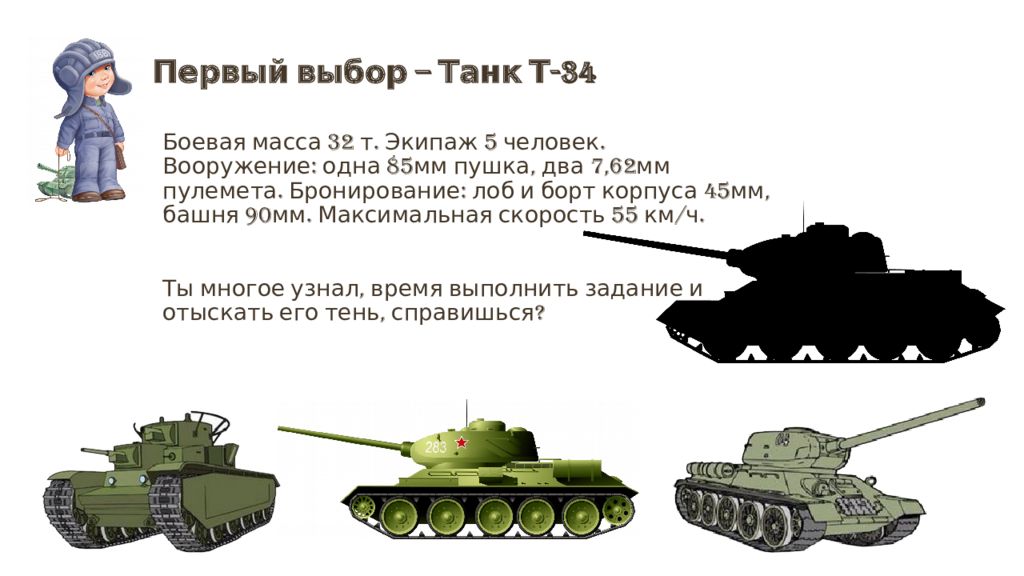 Боевая масса 32 т. Экипаж 5 человек. Вооружение: одна 85мм пушка, два 7,62мм пулемета. Бронирование: лоб и борт корпуса 45мм, башня 90мм. Максимальная скорость 55 км/ч. Ты многое узнал, время выполнить задание и отыскать его тень, справишься?