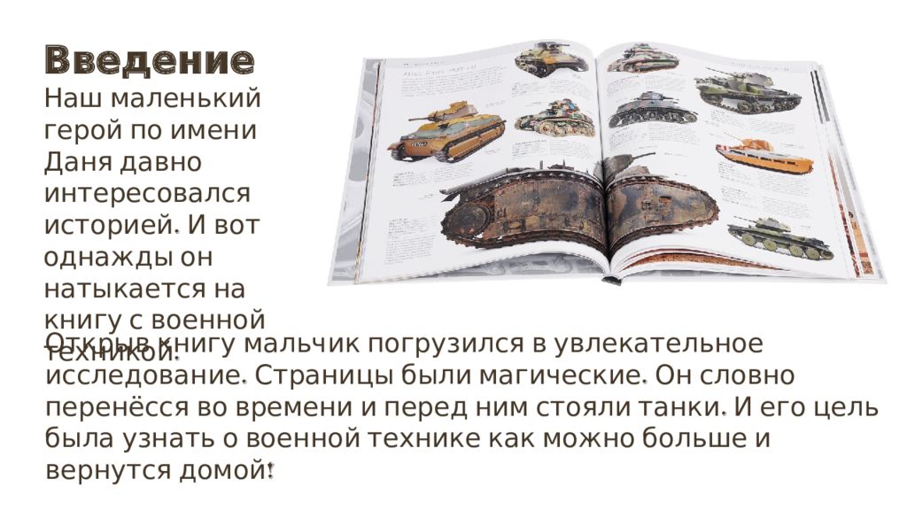 Введение Наш маленький герой по имени Даня давно интересовался историей. И вот однажды он натыкается на книгу с военной техникой. Открыв книгу мальчик погрузился в увлекательное исследование. Страницы были магические. Он словно перенёсся во времени и перед ним стояли танки. И его цель была узнать о военной технике как можно больше и вернутся домой!