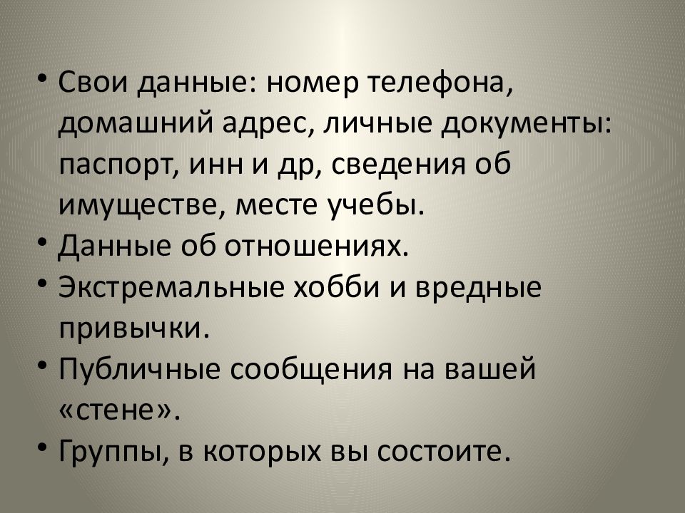 Свои данные: номер телефона, домашний адрес, личные документы: паспорт, инн и др, сведения об имуществе, месте учебы. Данные об отношениях. Экстремальные хобби и вредные привычки. Публичные сообщения на вашей «стене». Группы, в которых вы состоите.