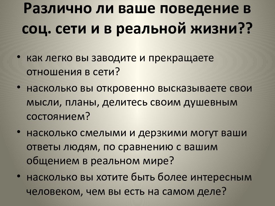 как легко вы заводите и прекращаете отношения в сети? насколько вы откровенно высказываете свои мысли, планы, делитесь своим душевным состоянием? насколько смелыми и дерзкими могут ваши ответы людям, по сравнению с вашим общением в реальном мире? насколько вы хотите быть более интересным человеком, чем вы есть на самом деле?