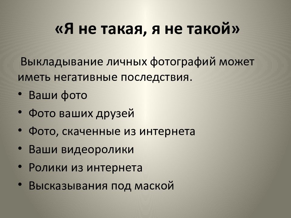 Выкладывание личных фотографий может иметь негативные последствия. Ваши фото Фото ваших друзей Фото, скаченные из интернета Ваши видеоролики Ролики из интернета Высказывания под маской