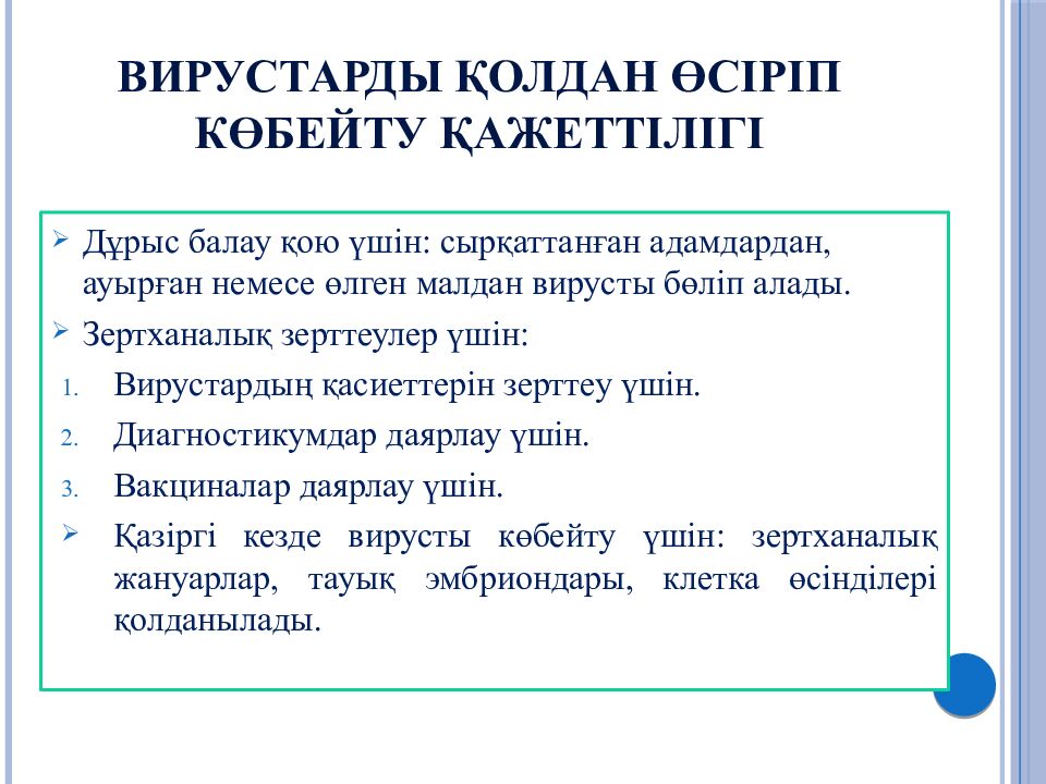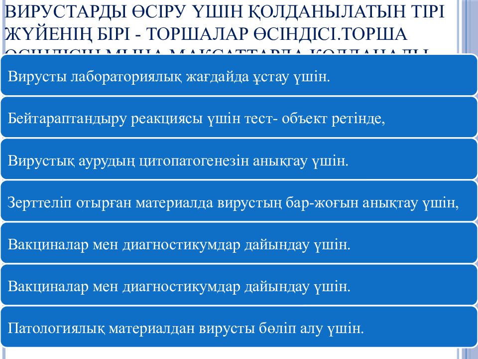 Слайд 33: Вирустарды өсіру үшін қолданылатын тірі жүйенің бірі - торшалар өсіндісі.Торша өсіндісін мына мақсаттарда қолданады:
