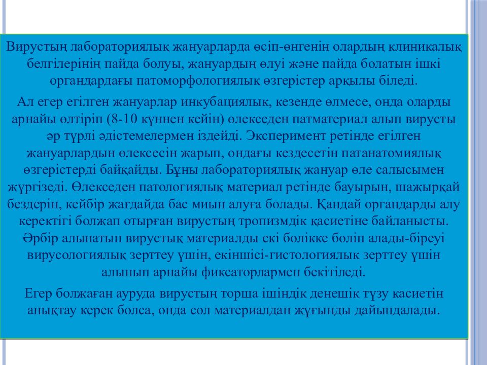 Вирустың лабораториялық жануарларда өсіп-өнгенін олардың клиникалық белгілерінің пайда болуы, жануардың өлуі және пайда болатын ішкі органдардағы патоморфологиялық өзгерістер арқылы біледі. Ал егер егілген жануарлар инкубациялык, кезенде өлмесе, онда оларды арнайы өлтіріп (8-10 күннен кейін) өлекседен патматериал алып вирусты әр түрлі әдістемелермен іздейді. Эксперимент ретінде егілген жануарлардын өлексесін жарып, ондағы кездесетін патанатомиялық өзгерістерді байқайды. Бұны лабораториялық жануар өле салысымен жүргізеді. Өлекседен патологиялық материал ретінде бауырын, шажырқай бездерін, кейбір жағдайда бас миын алуға болады. Қандай органдарды алу керектігі болжап отырған вирустың тропизмдік қасиетіне байланысты. Әрбір алынатын вирустық материалды екі бөлікке бөліп алады-біреуі вирусологиялық зерттеу үшін, екіншісі-гистологиялык зерттеу үшін алынып арнайы фиксаторлармен бекітіледі. Егер болжаған ауруда вирустың торша ішіндік денешік түзу касиетін анықтау керек болса, онда сол материалдан жұғынды дайындалады.