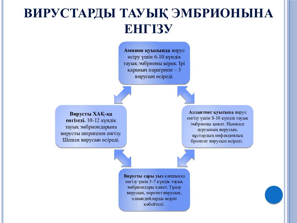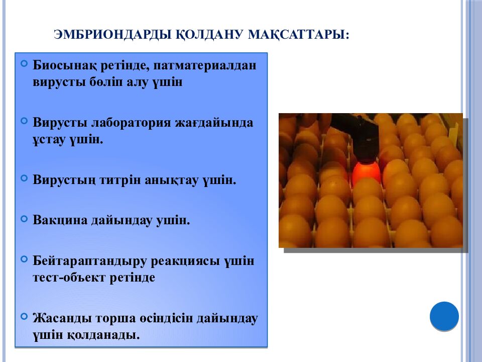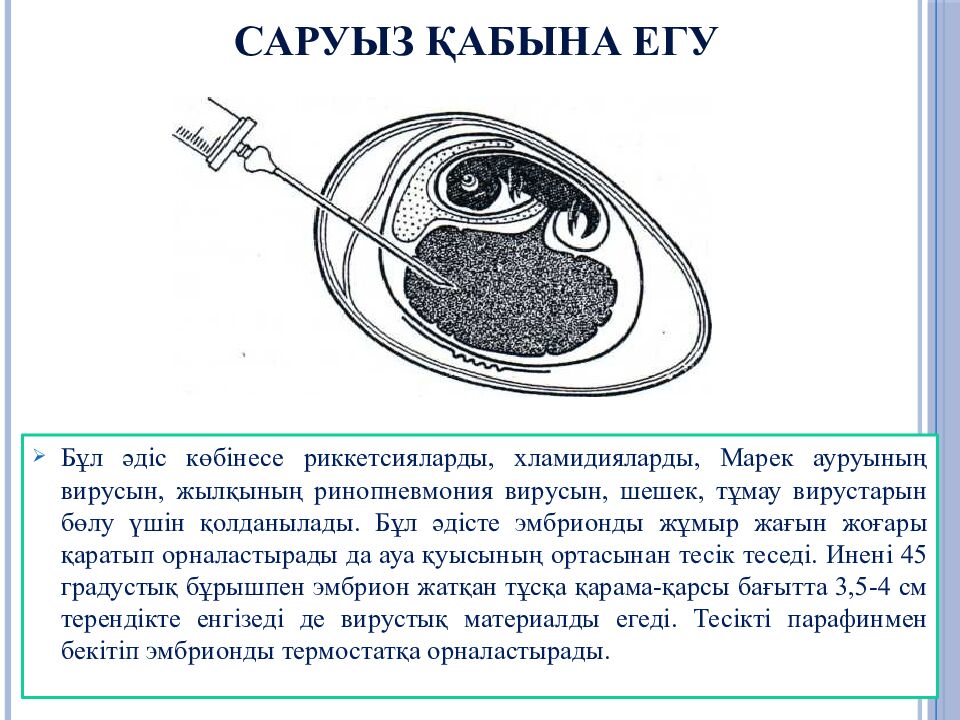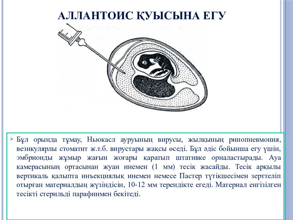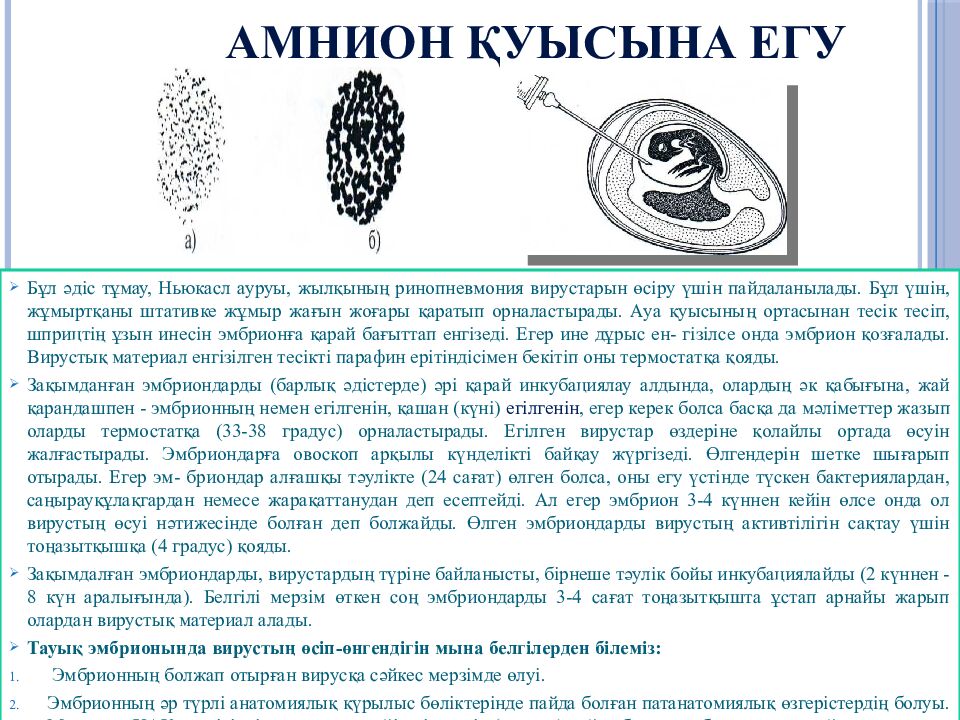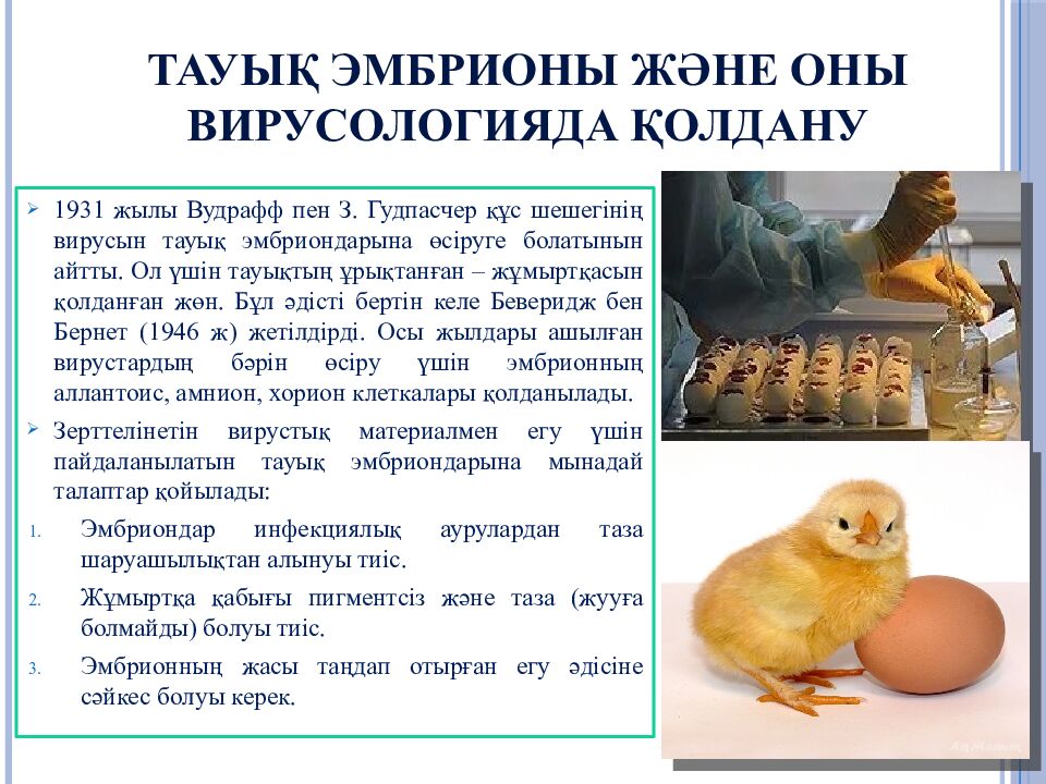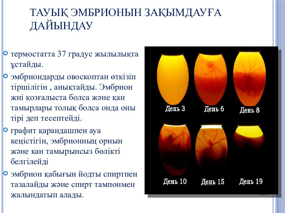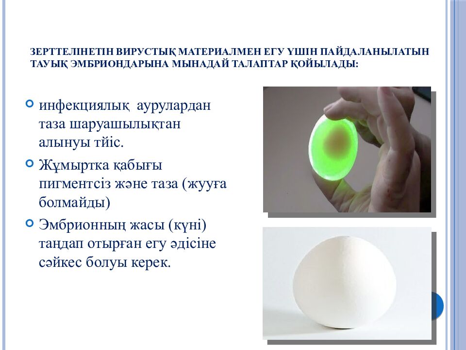 Слайд 25: Зерттелінетін вирустық материалмен егу үшін пайдаланылатын тауық эмбриондарына мынадай талаптар қойылады:
