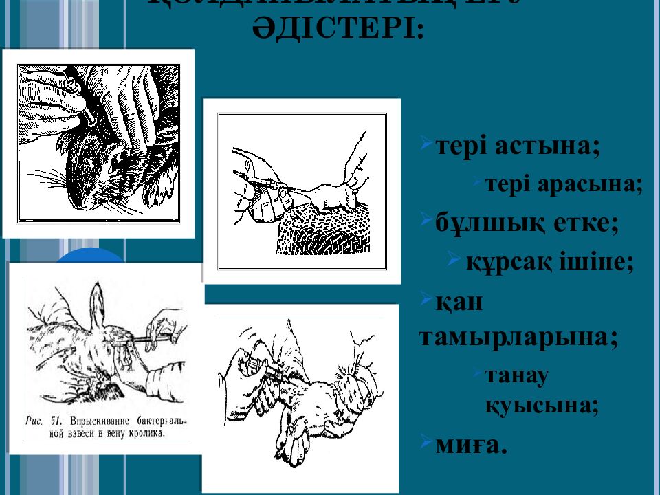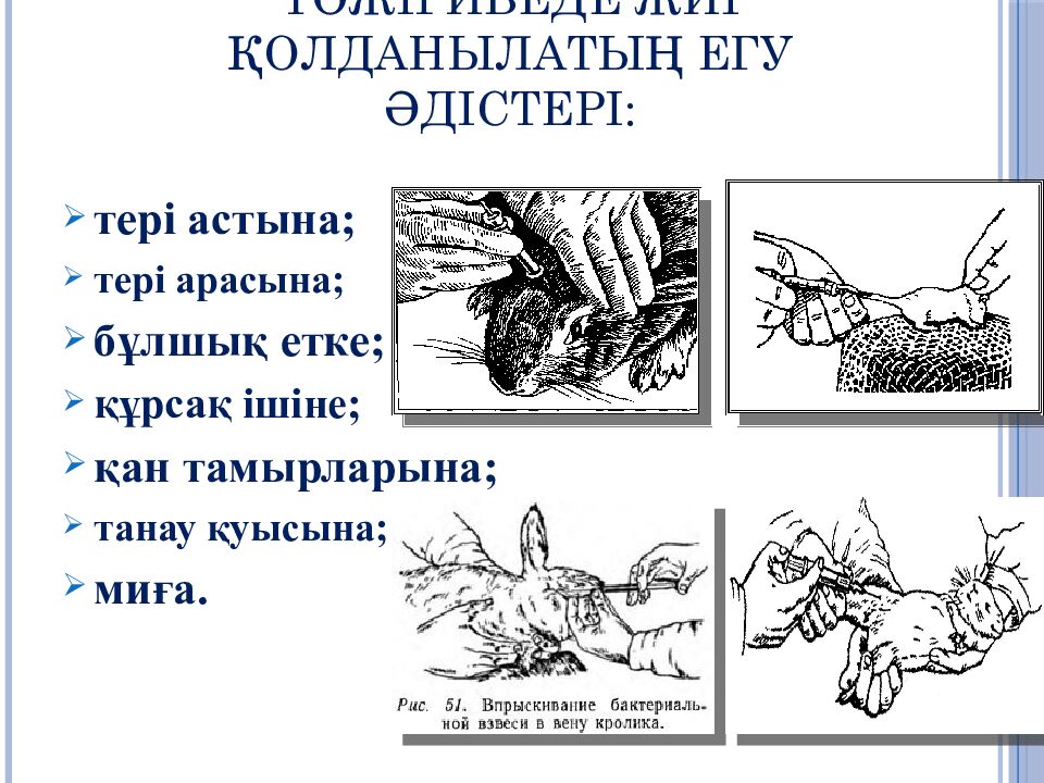 Тәжірибеде жиі қолданылатың егу әдістері: тері астына; тері арасына; бұлшық етке; құрсақ ішіне; қан тамырларына; танау қуысына; миға.