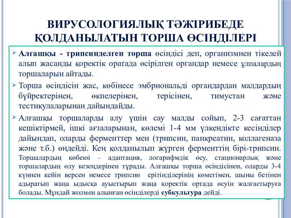 Слайд 34: Вирусологиялық тәжірибеде ҚОЛДАНЫЛАТЫН торша өсінділері