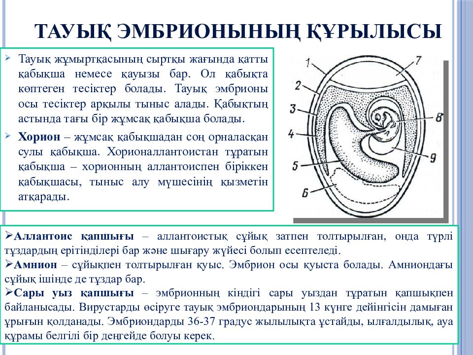 Тауық жұмыртқасының сыртқы жағында қатты қабықша немесе қауызы бар. Ол қабықта көптеген тесіктер болады. Тауық эмбрионы осы тесіктер арқылы тыныс алады. Қабықтың астында тағы бір жұмсақ қабықша болады. Хорион – жұмсақ қабықшадан соң орналасқан сулы қабықша. Хорионаллантоистан тұратын қабықша – хорионның аллантоиспен біріккен қабықшасы, тыныс алу мүшесінің қызметін атқарады. Аллантоис қапшығы – аллантоистық сұйық затпен толтырылған, онда түрлі тұздардың ерітінділері бар және шығару жүйесі болып есептеледі. Амнион – сұйықпен толтырылған қуыс. Эмбрион осы қуыста болады. Амниондағы сұйық ішінде де тұздар бар. Сары уыз қапшығы – эмбрионның кіндігі сары уыздан тұратын қапшықпен байланысады. Вирустарды өсіруге тауық эмбриондарының 13 күнге дейінгісін дамыған ұрығын қолданады. Эмбриондарды 36-37 градус жылылықта ұстайды, ылғалдылық, ауа құрамы белгілі бір деңгейде болуы керек.