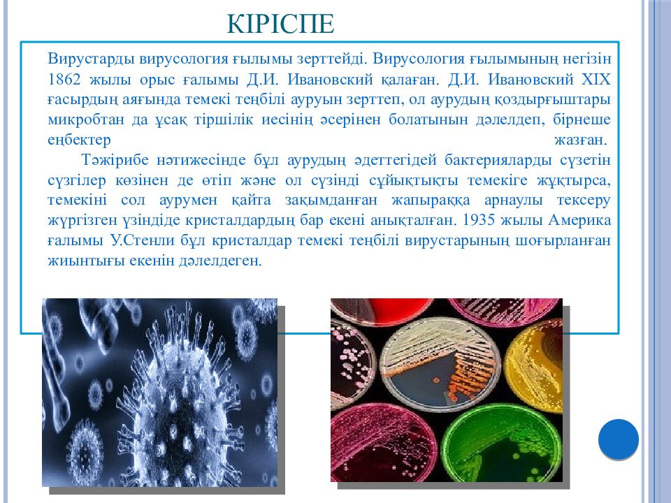 Вирустарды вирусология ғылымы зерттейді. Вирусология ғылымының негізін 1862 жылы орыс ғалымы Д.И. Ивановский қалаған. Д.И. Ивановский ХІХ ғасырдың аяғында темекі теңбілі ауруын зерттеп, ол аурудың қоздырғыштары микробтан да ұсақ тіршілік иесінің әсерінен болатынын дәлелдеп, бірнеше еңбектер жазған. Тәжірибе нәтижесінде бұл аурудың әдеттегідей бактерияларды сүзетін сүзгілер көзінен де өтіп және ол сүзінді сұйықтықты темекіге жұқтырса, темекіні сол аурумен қайта зақымданған жапыраққа арнаулы тексеру жүргізген үзіндіде кристалдардың бар екені анықталған. 1935 жылы Америка ғалымы У.Стенли бұл кристалдар темекі теңбілі вирустарының шоғырланған жиынтығы екенін дәлелдеген.