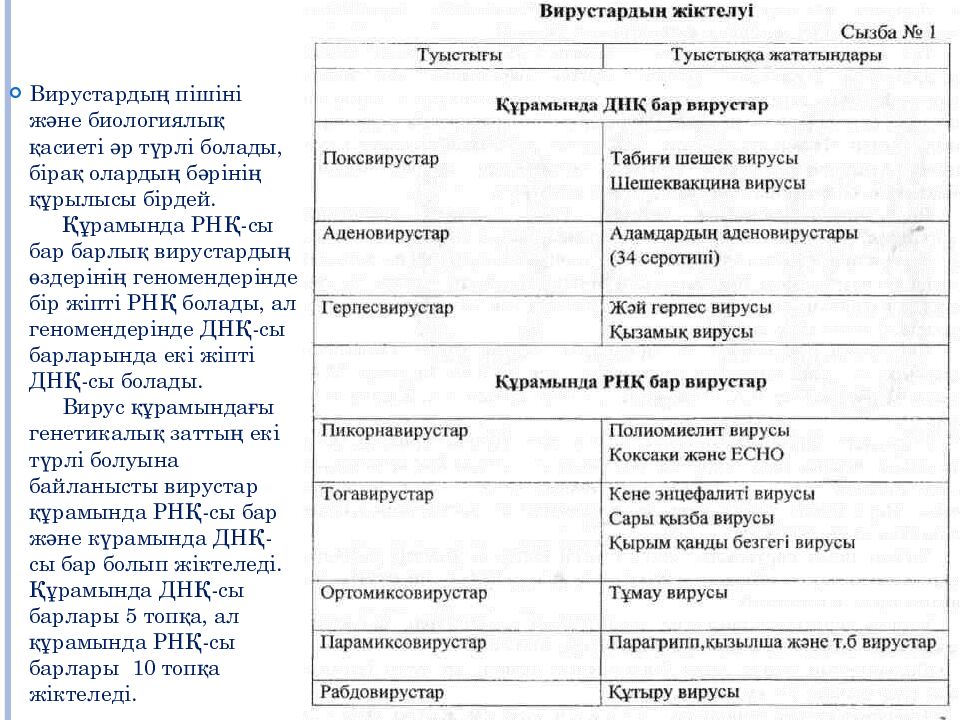 Вирустардың пішіні және биологиялық қасиеті әр түрлі болады, бірақ олардың бәрінің құрылысы бірдей. Құрамында РНҚ-сы бар барлық вирустардың өздерінің геномендерінде бір жіпті РНҚ болады, ал геномендерінде ДНҚ-сы барларында екі жіпті ДНҚ-сы болады. Вирус құрамындағы генетикалық заттың екі түрлі болуына байланысты вирустар құрамында РНҚ-сы бар және күрамында ДНҚ-сы бар болып жіктеледі. Құрамында ДНҚ-сы барлары 5 топқа, ал құрамында РНҚ-сы барлары 10 топқа жіктеледі.