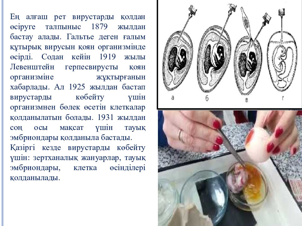 1931 жылы Вудрафф пен З. Гудпасчер құс шешегінің вирусын тауық эмбриондарына өсіруге болатынын айтты. Ол үшін тауықтың ұрықтанған – жұмыртқасын қолданған жөн. Бұл әдісті бертін келе Беверидж бен Бернет (1946 ж) жетілдірді. Осы жылдары ашылған вирустардың бәрін өсіру үшін эмбрионның аллантоис, амнион, хорион клеткалары қолданылады. Зерттелінетін вирустық материалмен егу үшін пайдаланылатын тауық эмбриондарына мынадай талаптар қойылады: Эмбриондар инфекциялық аурулардан таза шаруашылықтан алынуы тиіс. Жұмыртқа қабығы пигментсіз және таза (жууға болмайды) болуы тиіс. Эмбрионның жасы таңдап отырған егу әдісіне сәйкес болуы керек.