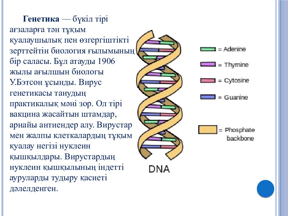 Генетика — бүкіл тірі ағзаларға тән тұқым қуалаушылық пен өзгергіштікті зерттейтін биология ғылымының бір саласы. Бұл атауды 1906 жылы ағылшын биологы У.Бэтсон ұсынды. Вирус генетикасы танудың практикалық мәні зор. Ол тірі вакцина жасайтын штамдар, арнайы антиендер алу. Вирустар мен жалпы клеткалардың тұқым қуалау негізі нуклеин қышқылдары. Вирустардың нуклеин қышқылының індетті ауруларды тудыру қасиеті дәлелденген.