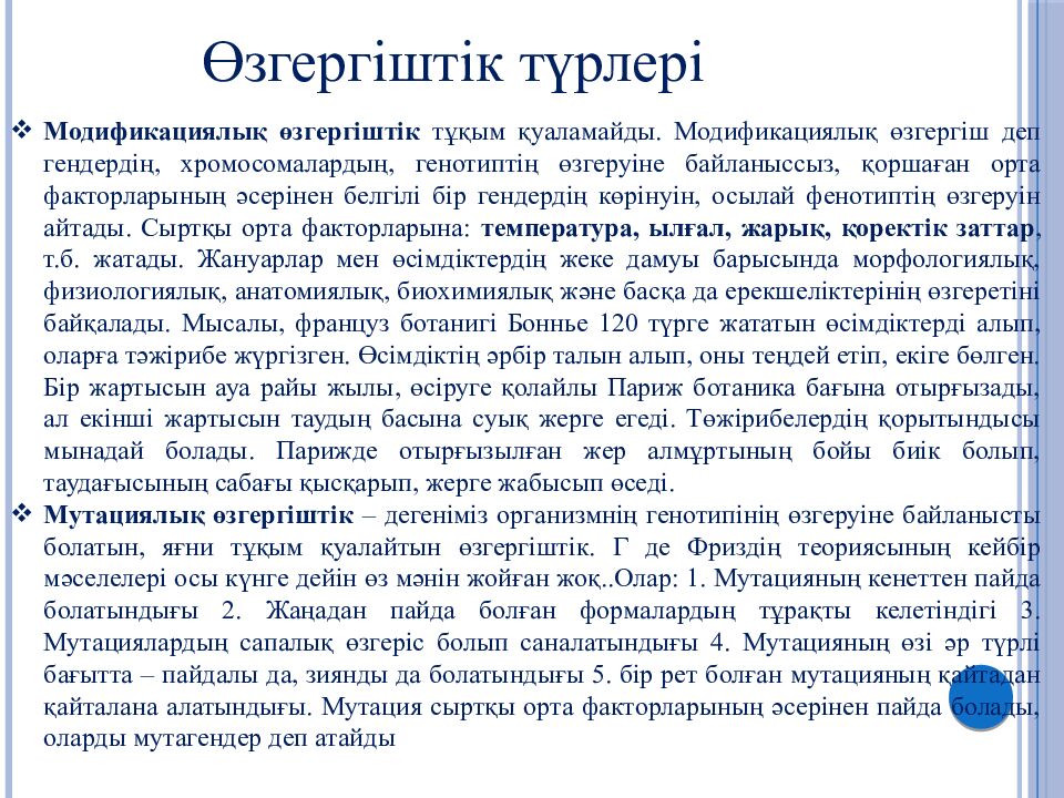 Өзгергіштік түрлері Модификациялық өзгергіштік тұқым қуаламайды. Модификациялық өзгергіш деп гендердің, хромосомалардың, генотиптің өзгеруіне байланыссыз, қоршаған орта факторларының әсерінен белгілі бір гендердің көрінуін, осылай фенотиптің өзгеруін айтады. Сыртқы орта факторларына: температура, ылғал, жарық, қоректік заттар, т.б. жатады. Жануарлар мен өсімдіктердің жеке дамуы барысында морфологиялық, физиологиялық, анатомиялық, биохимиялық және басқа да ерекшеліктерінің өзгеретіні байқалады. Мысалы, француз ботанигі Боннье 120 түрге жататын өсімдіктерді алып, оларға тәжірибе жүргізген. Өсімдіктің әрбір талын алып, оны теңдей етіп, екіге бөлген. Бір жартысын ауа райы жылы, өсіруге қолайлы Париж ботаника бағына отырғызады, ал екінші жартысын таудың басына суық жерге егеді. Төжірибелердің қорытындысы мынадай болады. Парижде отырғызылған жер алмұртының бойы биік болып, таудағысының сабағы қысқарып, жерге жабысып өседі. Мутациялық өзгергіштік – дегеніміз организмнің генотипінің өзгеруіне байланысты болатын, яғни тұқым қуалайтын өзгергіштік. Г де Фриздің теориясының кейбір мәселелері осы күнге дейін өз мәнін жойған жоқ..Олар: 1. Мутацияның кенеттен пайда болатындығы 2. Жаңадан пайда болған формалардың тұрақты келетіндігі 3. Мутациялардың сапалық өзгеріс болып саналатындығы 4. Мутацияның өзі әр түрлі бағытта – пайдалы да, зиянды да болатындығы 5. бір рет болған мутацияның қайтадан қайталана алатындығы. Мутация сыртқы орта факторларының әсерінен пайда болады, оларды мутагендер деп атайды