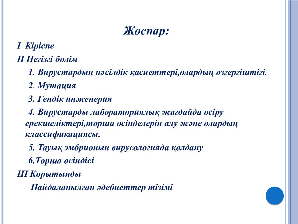 Жоспар: I Кіріспе II Негізгі бөлім 1. Вирустардың нәсілдік қасиеттері,олардың өзгергіштігі. 2. Мутация 3. Гендік инженерия 4. Вирустарды лабораториялық жағдайда өсіру ерекшеліктері,торша өсінделерін алу және олардың классификациясы. 5. Тауық эмбрионын вирусологияда қолдану 6.Торша өсіндісі III Қорытынды Пайдаланылған әдебиеттер тізімі