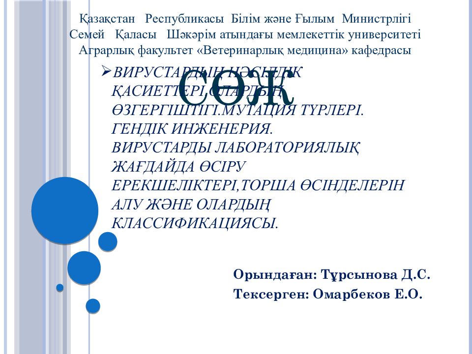 Орында ған: Тұрсынова Д.С. Тексерген: Омарбеков Е.О. Қазақстан Республикасы Білім және Ғылым Министрлігі Семей Қаласы Шәкәрім атындағы мемлекеттік университеті Аграрлық факультет «Ветеринарлық медицина» кафедрасы СӨЖ Вирустардың нәсілдік қасиеттері,олардың өзгергіштігі.Мутация түрлері. Гендік инженерия. Вирустарды лабораториялық жағдайда өсіру ерекшеліктері,торша өсінделерін алу және олардың классификациясы.