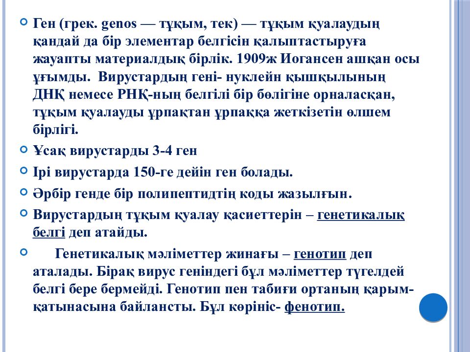 Ген (грек. genos — тұқым, тек) — тұқым қуалаудың қандай да бір элементар белгісін қалыптастыруға жауапты материалдық бірлік. 1909ж Иогансен ашқан осы ұғымды. Вирустардың гені - нуклейн қышқылының ДНҚ немесе РНҚ-ның белгілі бір бөлігіне орналасқан, тұқым қуалауды ұрпақтан ұрпаққа жеткізетін өлшем бірлігі. Ұсақ вирустарды 3-4 ген Ірі вирустарда 150-ге дейін ген болады. Әрбір генде бір полипептидтің коды жазылғын. Вирустардың тұқым қуалау қасиеттерін – генетикалық белгі деп атайды. Генетикалық мәліметтер жинағы – генотип деп аталады. Бірақ вирус геніндегі бұл мәліметтер түгелдей белгі бере бермейді. Генотип пен табиғи ортаның қарым-қатынасына байлансты. Бұл көрініс- фенотип.