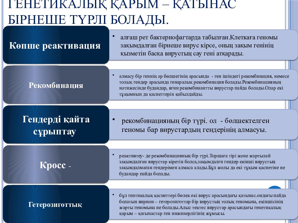 Первый слайд презентации: Вирустардың нәсілдік қасиеттері,олардың өзгергіштігі.Мутация түрлері. Гендік инженерия. Вирустарды лабораториялық жағдайда өсіру ерекшеліктері,торша өсінделерін алу және олардың классификациясы