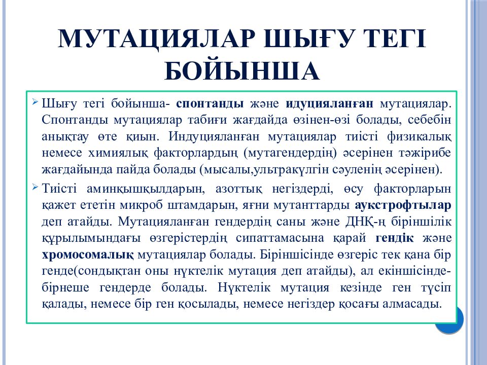 Шығу тегі бойынша- спонтанды және идуцияланған мутациялар. Спонтанды мутациялар табиғи жағдайда өзінен-өзі болады, себебін анықтау өте қиын. Индуцияланған мутациялар тиісті физикалық немесе химиялық факторлардың (мутагендердің) әсерінен тәжірибе жағдайында пайда болады (мысалы,ультракүлгін сәуленің әсерінен). Тиісті аминқышқылдарын, азоттық негіздерді, өсу факторларын қажет ететін микроб штамдарын, яғни мутанттарды аукстрофтылар деп атайды. Мутацияланған гендердің саны және ДНҚ-ң біріншілік құрылымындағы өзгерістердің сипаттамасына қарай гендік және хромосомалық мутациялар болады. Біріншісінде өзгеріс тек қана бір генде(сондықтан оны нүктелік мутация деп атайды), ал екіншісінде-бірнеше гендерде болады. Нүктелік мутация кезінде ген түсіп қалады, немесе бір ген қосылады, немесе негіздер қосағы алмасады.