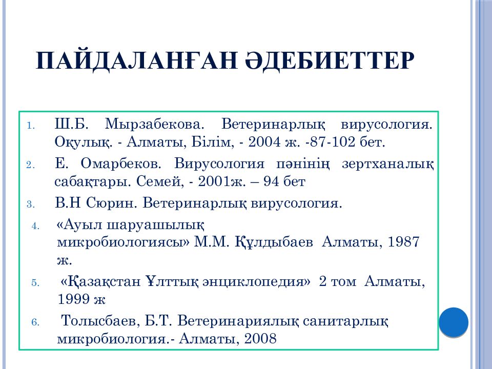 Ш. Б. Мырзабекова. Ветеринарлық вирусология. Оқулық. - Алматы, Білім, - 2004 ж. -87-102 бет. Е. Омарбеков. Вирусология пәнінің зертханалық сабақтары. Семей, - 2001ж. – 94 бет В. Н Сюрин. Вет еринарлық вирусология. « Ауыл шаруашылық микробиологиясы » М.М. Құлдыбаев Алматы, 1987 ж. «Қазақстан Ұлттық энциклопедия» 2 том Алматы, 1999 ж Толысбаев, Б.Т. Ветеринариялық санитарлық микробиология.- Алматы, 2008