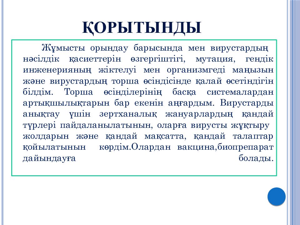 Жұмысты орындау барысында мен вирустардың нәсілдік қасиеттерін өзгергіштігі, мутация, гендік инженерияның жіктелуі мен организмгеді маңызын және вирустардың торша өсіндісінде қалай өсетіндігін білдім. Торша өсінділерінің басқа системалардан артықшылықтарын бар екенін аңғардым. Вирустарды анықтау үшін зертханалық жануарлардың қандай түрлері пайдаланылатынын, оларға вирусты жұқтыру жолдарын және қандай мақсатта, қандай талаптар қойылатынын көрдім.Олардан вакцина,биопрепарат дайындауға болады.