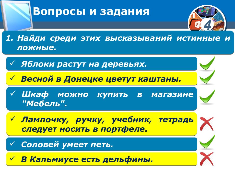 Найди среди этих высказываний истинные и ложные. Яблоки растут на деревьях. Весной в Донецке цветут каштаны. Шкаф можно купить в магазине "Мебель". Лампочку, ручку, учебник, тетрадь следует носить в портфеле. Соловей умеет петь. В Кальмиусе есть дельфины.