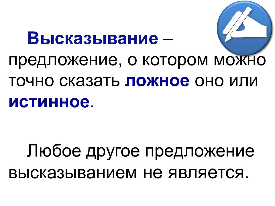 Высказывание – предложение, о котором можно точно сказать ложное оно или истинное. Любое другое предложение высказыванием не является.