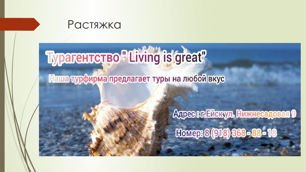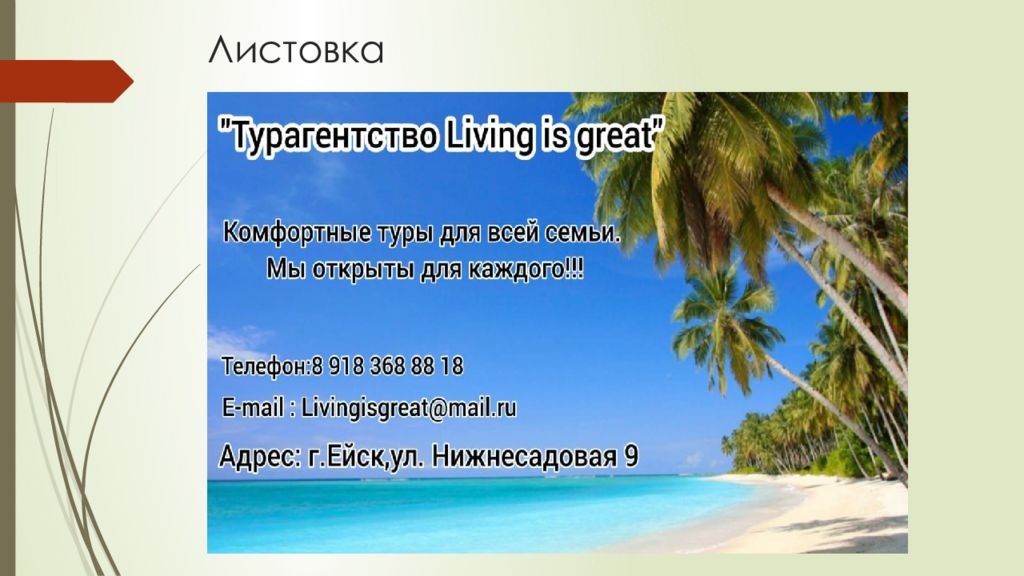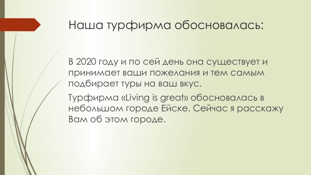 В 2020 году и по сей день она существует и принимает ваши пожелания и тем самым подбирает туры на ваш вкус. Турфирма « Living is great » обосновалась в небольшом городе Ейске. Сейчас я расскажу Вам об этом городе.