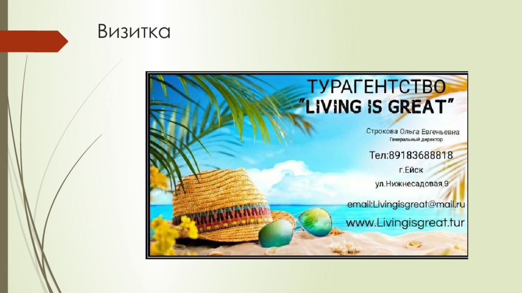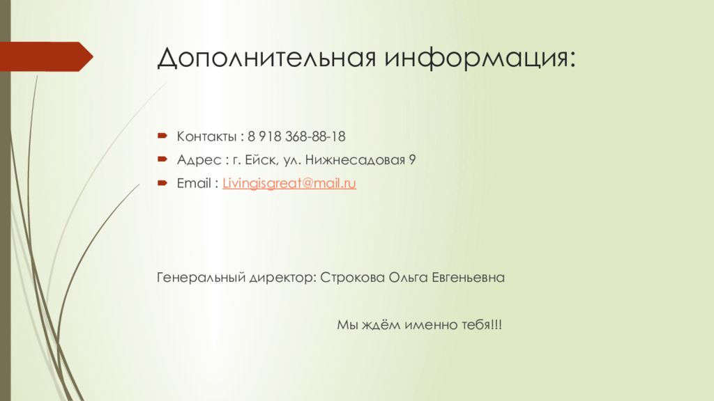 Контакты : 8 918 368-88-18 Адрес : г. Ейск, ул. Нижнесадовая 9 Email : Livingisgreat@mail.ru Генеральный директор: Строкова Ольга Евгеньевна Мы ждём именно тебя!!!