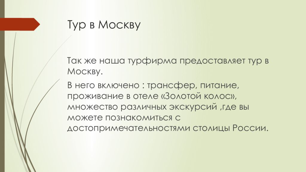 Так же наша турфирма предоставляет тур в Москву. В него включено : трансфер, питание, проживание в отеле «Золотой колос», множество различных экскурсий,где вы можете познакомиться с достопримечательностями столицы России.